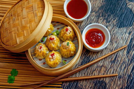 A Steamed dumplings served in bamboo basket with sauces Generative Ai