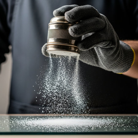 A hero detail shot focusing on the precise moment synthetic snow is dusted onto a surface. A tightly