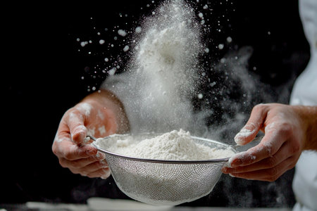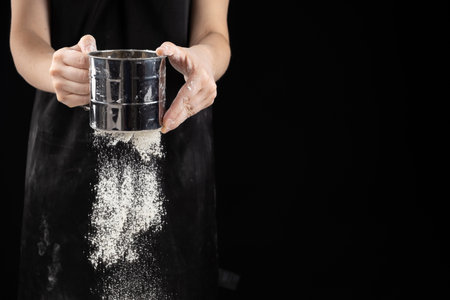 Preparing food by sifting flour on a black backgroung