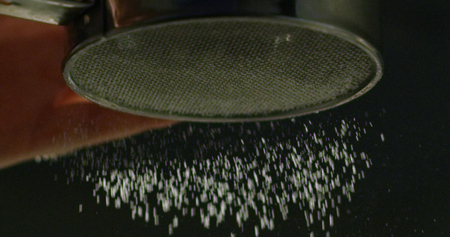 powdered sugar or flour is sifted into a bowl on a black background.