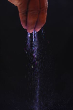 Close up of a man's hand holding sugar powder on dark background
