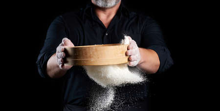 chef a man in a black uniform holds a round wooden sieve in his hands and sifts white wheat flour on a black background, the particles fly in different directions