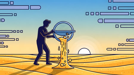 A man sifts sand through a sieve in a desert landscape at sunset. Clear details and vibrant color...