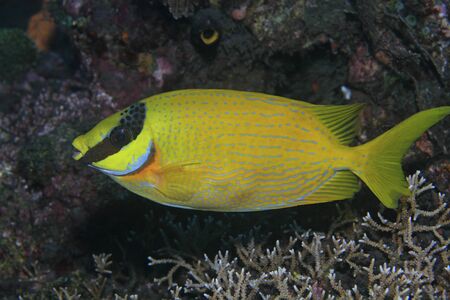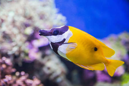 Colorful surgeonfish fish of sea aquarium with coral reef. Foxface rabbitfish: Siganus vulpinus species of family Siganidae. Fish of the Indian and Pacific Oceans, Australia and Hawaii.