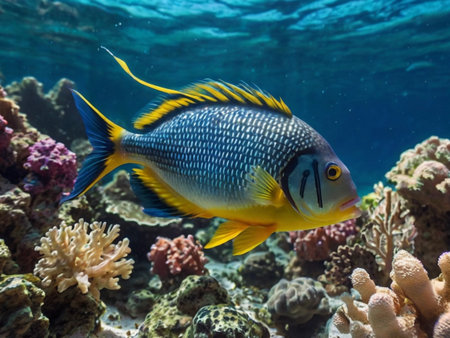 Colorful tropical fish swims gracefully among coral reef in a serene underwater habitat