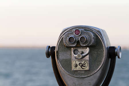 Public stationary binocular on sea shore, Coin operated metal binocular viewer on blurred background sea