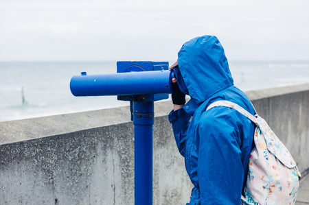 Woman looking through coin operated binoculars at seaside.