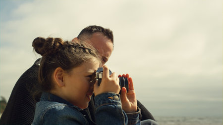 Sweet child taking photos on beach. Little girl holding photo camera on family trip close up. Peaceful kid enjoying nature view by calm water. Relaxing people looking sea landscape. Hobby concept.