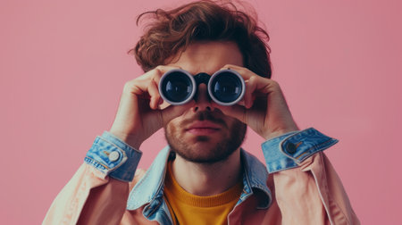 Portrait of young man looking through binoculars on pink background