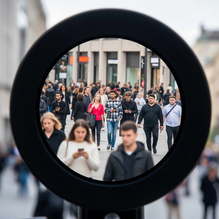 Urban reflections symbolize visual storytelling through camera lens held by hands