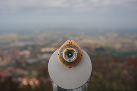 Close up of a tourist viewing telescope overlooking a town on a cloudy day with focus to the instrument