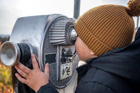 A little boy in a brown knitted woolen hat looks through the stationary observation coin binoculars at the colorful autumn Vermont hills landscape covered with red and yellow maple groves