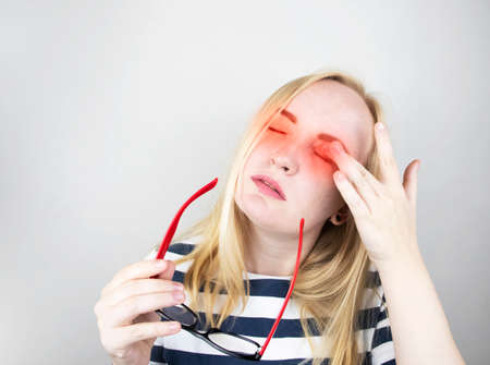 A woman rubs his tired eyes with his hands on a white background. Eye fatigue from the computer and fatigue from work. Pain in the eyes and forehead, migraine, eye diseases. On examination by a doctor.