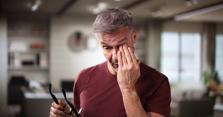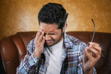 Man with tired eyes after long work holding his eyeglasses