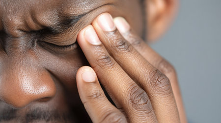 Experiencing discomfort, person is holding their face, indicating pain or distress. expression reflects struggle, possibly due to headache or eye strain