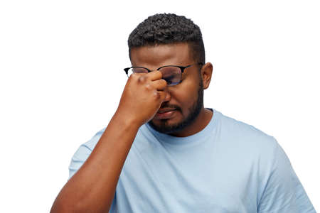 tired african man in lasses touching nose bridge