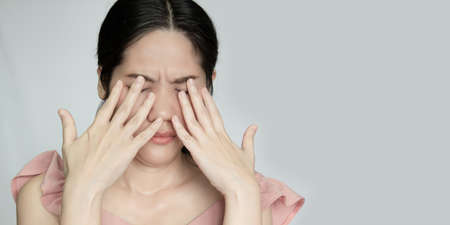 Asian beautiful woman raise hand covering her eyes with pain, tired and exhaust.
