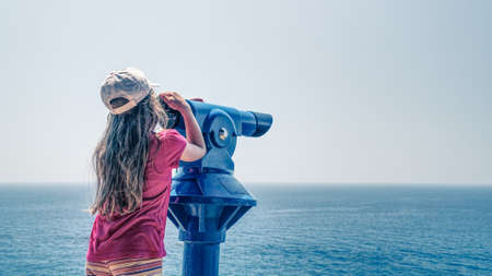Young long blond hair girl wearing red shirt and white cap observing a sea via a blue telescope