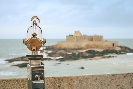 Telescope tower viewer viewing magnifier at mont saint michel chrome gold ocean view castle tower