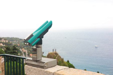 Public stationary binocular on sea shore, Coin operated metal binocular viewer on blurred background sea