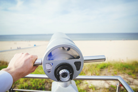 binocular at observation desk at sea beach close up