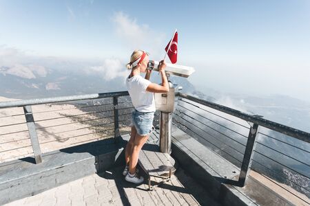 Young woman tourist stands on a viewing platform of Tahtali Mountain in Kemer with a red Turkey flag and looks in binoculars, Turkey