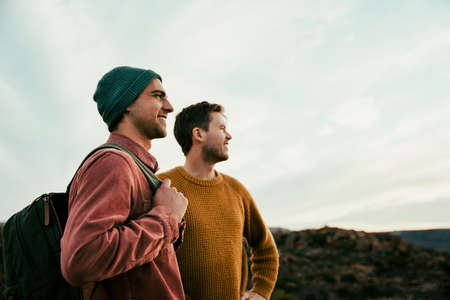 Two caucasian male friends on vacation walking in the wilderness embracing nature