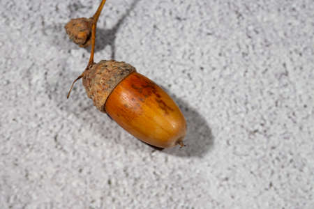 A detailed focus on a solitary acorn lying on a textured rocky ground, highlighting its natural earthy tones and textures, perfect for themes of nature and autumn.