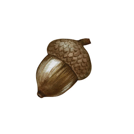 The acorn. Hand-drawn watercolor illustration. color image of the autumn element. The isolate. For labels, packages, printed products, stickers, posters and banners, for postcards and packaging.