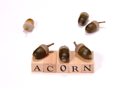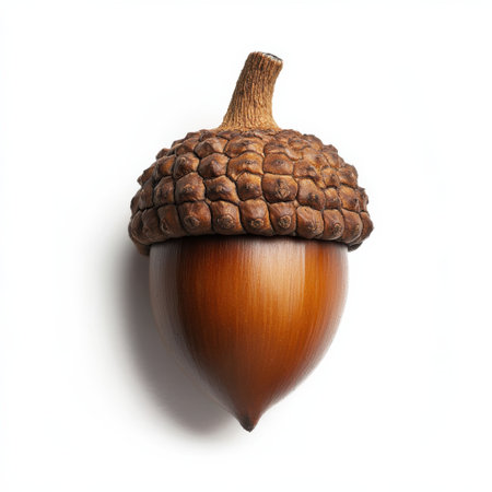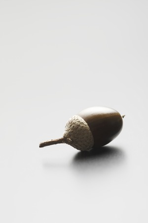 A single brown acorn rests prominently on a white surface, showing its textured cap and smooth body. The acorn's natural beauty emphasizes organic form and color contrast.
