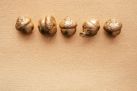 Wooden acorns arranged on a smooth beige background, showcasing various shades of brown and intricate details of the caps A perfect representation of nature s beauty