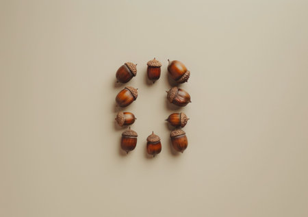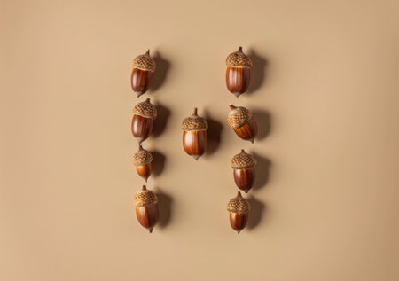 A collection of acorns arranged artfully on a light beige background Various sizes and shapes create an organic pattern
