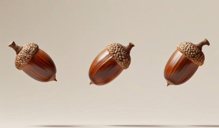 Three acorns floating against a soft pastel background, showcasing natural textures and warm colors. Nature and autumn concept.