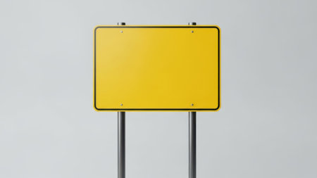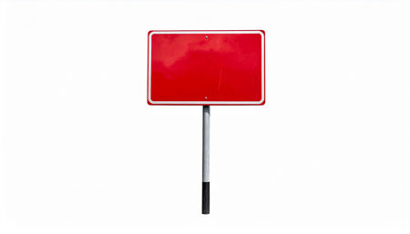 A blank red rectangular sign with a white border stands on a metal pole against a white background.