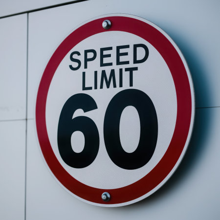 A close-up view of a round traffic sign indicating a speed limit of 60. The sign features black text and numerals on a white background, enclosed by a bold red border. Two silver rivets are visible, securing the sign to a slightly textured, light-colored wall or surface. The composition highlights the clear directive of the road safety signage.