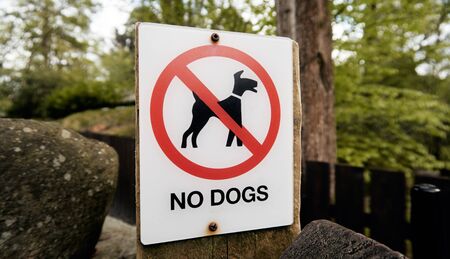 A keep out sign on a tourist countryside trail showing that dogs are banned form walking on the field and land. Dogs bans in public and private places. Dog bans across the world.