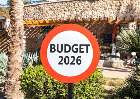 Budget 2026 symbol. Concept words Budget 2026 on beautiful white and red road sign. Beautiful palm trees palm-trees background. Business and budget 2026 concept. Copy space.