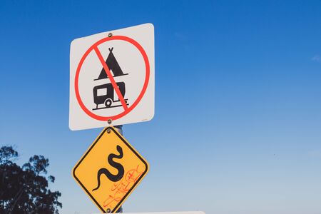 HOBART, AUSTRALIA - September 19th, 2019: road sign about snake threat and no camping near a beach in Tasmania Australia