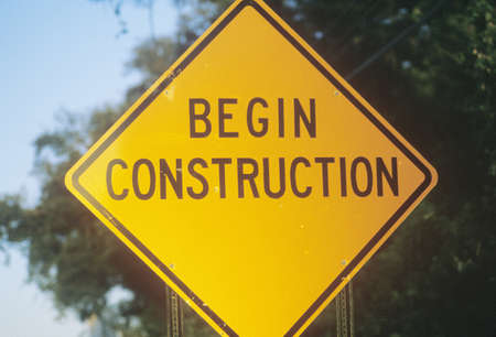 Close up of sign of road work on background of blue sky with white clouds. Information for traffic participants about carrying out repairs on road. Concept of careful and attentive driving