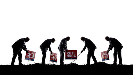 Silhouette of multiple raised hands against a white background, conveying concepts of voting