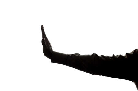 Man's hand shows a symbol of a stop, denial, disagreement - silhouette