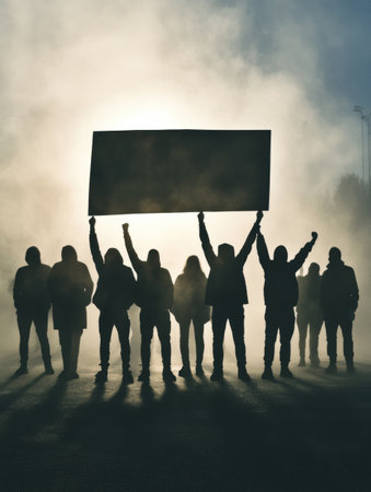 Silhouetted activists stand united in fog, raising banners and fists, conveying urgency for social change in a striking evening atmosphere.