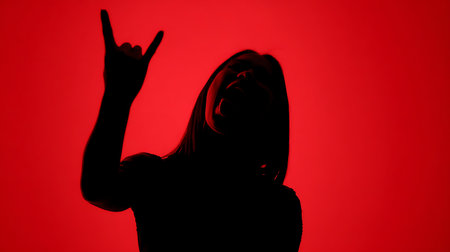 Silhouette of a young woman on a red background. The girl shows the middle finger.