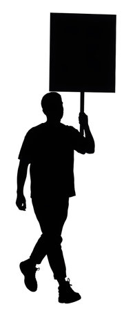 A black silhouette of a person walking while holding a blank black sign. Clear details and vibran...