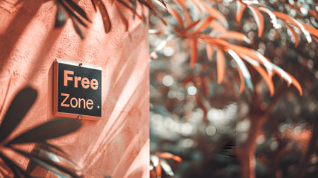 Free Zone sign on coral wall with tropical foliage. Urban oasis concept with Free Zone signage and plants. Tranquil Free Zone corner with warm peach fuzz or coral tones