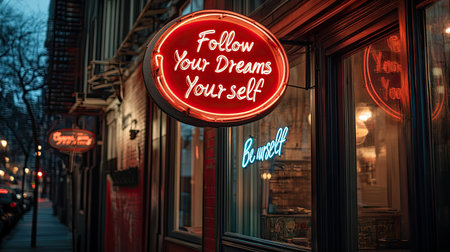 A captivating neon sign reading Follow Your Dreams Yourself illuminated at night. This image embodies motivation and encourages personal growth and self-reflection.