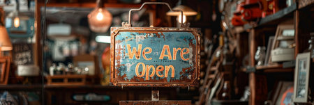 Rustic 'We Are Open' sign in an antique store with a warm, inviting atmosphere. Perfect for promoting local businesses, vintage shops, and rustic settings.