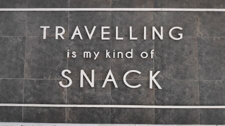 The words `Traveling is My Snack` on the wooden boards are posted on the white walls