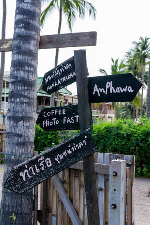 Wooden arrows signboards on the beach resort. Spider House. Wahine beach bar