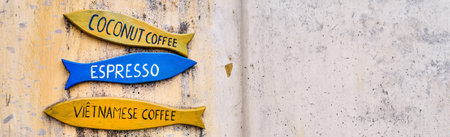 Colorful wooden coffee signposts on a textured beige wall with space for text, depicting different coffee types including coconut, espresso, and Vietnamese coffee